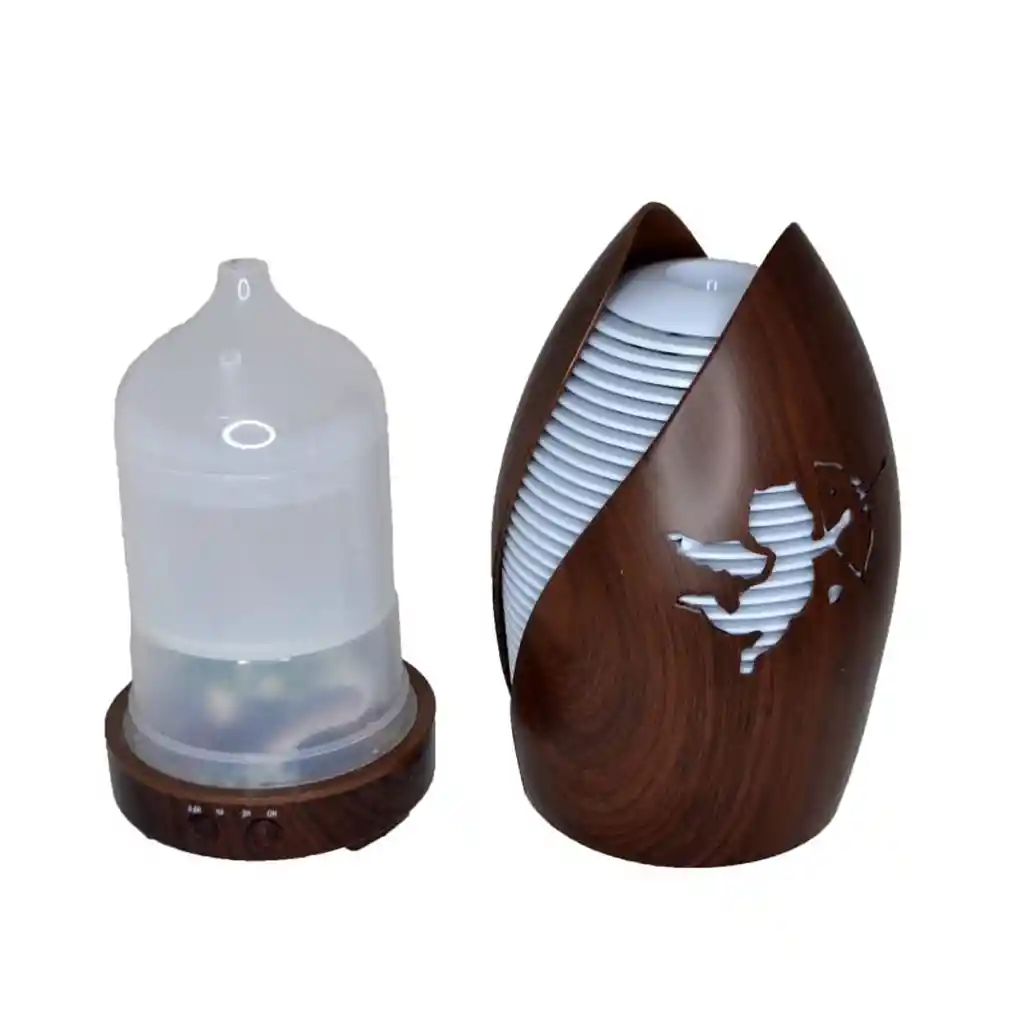 Un difusor ultrasónico de vapor frío con diseño decorativo inspirado en pétalos entrelazados. Su acabado tipo madera oscura, junto con su luz ambiental y tecnología silenciosa, lo hacen ideal para aromaterapia, humidificación de espacios y decoración moderna Tecnología: Ultrasonido (vapor frío) Capacidad del tanque: 130 a 150 ml Material: Plástico ABS y PP con acabado imitación madera Iluminación: Luz LED interna cálida (efecto tenue) Fuente de alimentación: Cable USB (5V – incluido) Modos de funcionamiento: Encendido / apagado con un botón Duración de uso: Hasta 5 horas en modo continuo Apagado automático: Sí, al quedarse sin agua Ruido: 30 dB (ultrasilencioso) Tamaño aproximado: 14 x 8 cm Peso: Aprox. 250 gramos Funciones destacadas Difusor de aceites esenciales para aromaterapia Humidificador de vapor frío para mejorar la calidad del aire Luz ambiental cálida para crear espacios relajantes Diseño único que simula hojas o pétalos, ideal para decorar Fácil de operar con un solo botón