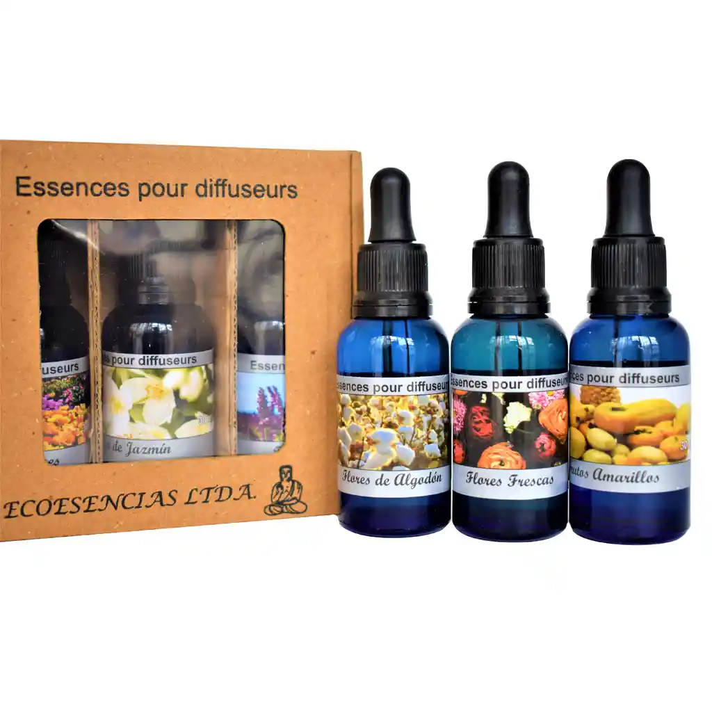 ESENCIAS HIDROSOLUBLES PARA HUMIDIFICADOR O DIFUSOR Después de la compra le envías un mensaje al mensajero con los aromas que deseas que te enviemos si el no recibe el mensaje enviaremos las esencias de la imagen Kit por 3 Esencias con gotero 30 mililitros cada Fragancia Ofrecemos 54 aromas: Bosque de Eucalipto Bosque de Pino Brisa Hawaiana Brisa Marina Citronella Coco Coco Vainilla Corteza de Sándalo Durazno Fantasía Frutal Fiesta de Flores Flor de Jazmín Flor de Lavanda Flor de Limón Flor de Manzanilla Flor de Primavera Flor de Romero Flor de Ruda Flor de Vainilla Flor de Verbena Flor de Violeta Flor de Orquidea Flores de Algodón Flores de Seda Flores Frescas Fresa Frutos Amarillos Frutos Rojos Hierbabuena Juan del Dinero Kiwi Limoncillo Madera India Manzana Verde Maracuyá Picadura de Tabaco Raíz de Mandrágora Rollos de Canela Rosa Roja Shadday Talco Baby Tutty Frutty Acqua Flores de Otoño Mango Papaya Mora Limón Sierra Nevada Cascara de Mandarina Limonada de Coco Menta Fresca Puesta de Sol Tánguelo Te verde Aromas que perduran en cualquier entorno gracias a su concentración que hacen un ambiente mas relajante. lleno de vida y naturaleza Ecoesencias SAS 20 años Aromatizamos el mundo