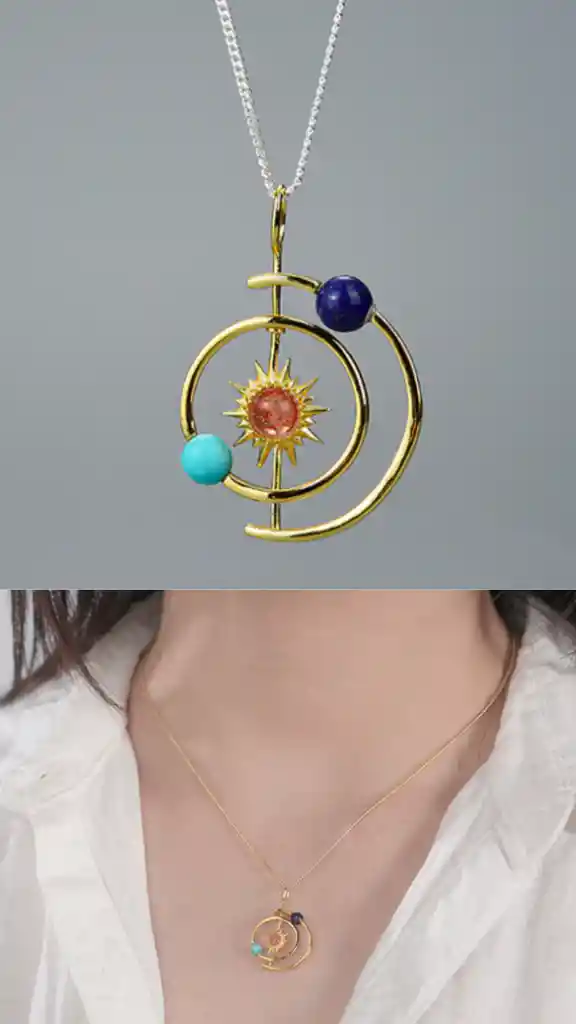 Dije del sistema solar con piedras semipreciosas: turquesa y lapislázuli en plata de ley 925 con baño de oro de 18K. Sólo el dije