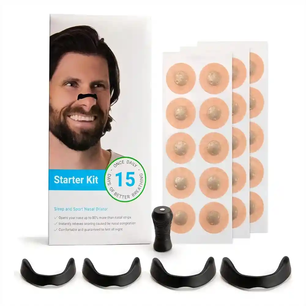 Durante el sueño, si el cuerpo cambia de posición bruscamente, es posible que el dilatador nasal se despegue o caiga. En estos casos, el producto no ejercerá su efecto correctamente. Para mejores resultados, asegúrese de colocar el parche firmemente antes de dormir y evite movimientos bruscos al acostarse. Disfrute de noches sin ronquidos--- Nuestro dilatador nasal magnético alivia eficazmente la congestión nasal y reduce los ronquidos, brindando una solución cómoda, no invasiva y agradable para la piel. Perfecto para mejorar la calidad del sueño de forma natural. ---Mejora inmediata del flujo de aire--- Equipado con tiras adhesivas magnéticas y bandas nasales dobles, este innovador diseño abre hasta un 80% más la cavidad nasal que las tiras comunes, permitiendo una mayor entrada de oxígeno y una respiración más fluida durante toda la noche. ---Ideal para dormir, viajar y hacer deporte--- Ya sea en casa, en hoteles, en viajes largos o durante actividades físicas, este kit antirronquidos es tu aliado ideal para mantener las vías respiratorias abiertas y disfrutar de un descanso profundo sin interrupciones. Kit completo de inicio con 30 parches Incluye 30 pegatinas magnéticas nasales (15 pares desechables), 4 bandas reutilizables en diferentes tamaños y 1 aplicador magnético para facilitar su colocación. Todo lo necesario para un mes completo de respiración sin ronquidos. ---Cómodo, seguro y fácil de usar--- Fabricado con materiales suaves y seguros, el parche se adhiere firmemente sin irritar la piel. El aplicador ergonómico y el manual incluido facilitan cada paso para una experiencia sin complicaciones.