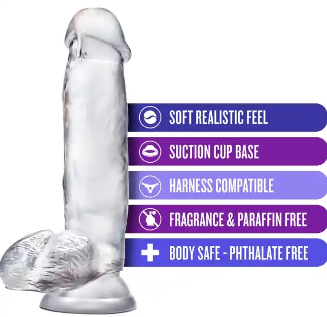 Este hermoso dildo con testículos transparente hace juego con el brillo de tu feminidad, esta edición de lujo te está buscando para cumplir tus fantasías, su glande y venas pronunciadas estimula el punto G de una forma que no lo creerás. Ideal para juegos vaginales y anales, fabricado en elastómeros termo plásticos, sanos para el cuerpo. Puedes adherirlo a cualquier superficie plana con su ventosa o incluso usarlo con un arnés universal para intensificar tus experiencias y juegos íntimos.