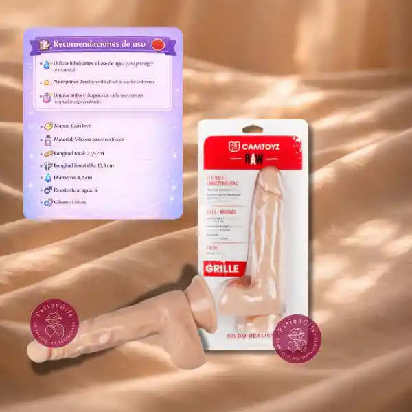 El Dildo Realista Grille 21,5 cm está diseñado para ofrecer firmeza, estabilidad y una experiencia realista, gracias a su estructura con núcleo interno sólido y su acabado detallado en silicona suave. Fabricado en silicona médica no tóxica, proporciona un contacto cómodo y seguro con la piel. Su ventosa de alta sujeción permite fijarlo fácilmente en superficies lisas, ampliando las posibilidades de uso y facilitando diferentes posiciones. Distribuido por PasionGift, este dildo combina diseño realista, funcionalidad y versatilidad, siendo compatible también con arneses universales para explorar nuevas dinámicas. Características • Diseño realista con textura detallada • Ventosa de alta sujeción para superficies lisas • Núcleo interno firme para mayor estabilidad • Silicona suave no tóxica y segura para el cuerpo • Compatible con arnés universal • 100% impermeable y fácil de limpiar Especificaciones • Marca: CamToyz • Material: Silicona suave no tóxica • Resistente al agua: Sí • Uso: Unisex Tamaño • Longitud total: 21,5 cm • Longitud insertable: 15,5 cm • Diámetro aproximado: 4,2 cm Recomendación Para una mejor experiencia se recomienda utilizar lubricante a base de agua y limpiar el producto antes y después de cada uso.