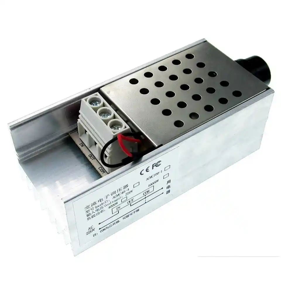 Voltaje: AC 110- 220V Potencia maxima: 10000W (5000W se pueden usar a temperatura ambiente durante mucho tiempo) Regulacion de voltaje: CA 10V a 220V (ajuste comenzar 20V) Tamaño del producto: aprox. 150 * 60 * 47 mm / 5.9 * 2.36 * 1.85 '' Peso neto: aprox. 230 g Diseño de doble placa de circuito. Condensador de alto voltaje. Diodo de disparo ST. Con disipador de calor. Aplicaciones: Horno electrico, el calentador de agua, las lamparas y las linternas que mueven la luz, el motor pequeño, el control de la temperatura de la plancha de soldadura, etc. (se debe reducir la potencia de carga inductiva o de capacidad, el regulador de voltaje esta equipado con histeresis bidireccional de alta potencia, no Puede agregar cualquier componente que pueda usar, muy conveniente y practico.) LA COMPRA INCLUYE: 1X REGULADOR POTENCIA AC DIMMER 10000 WATT