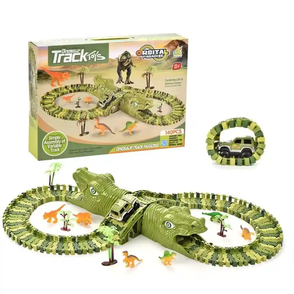 La nueva atracción sobre ruedas que divierte a grandes y chicos. Sus rieles FLEXIBLES se doblan y curvan hacia cualquier lugar Su tecnología de serpentina permite que se enrolle, doble, se flexione y se curva en cualquier dirección. Incluye: * 1 Jeep * 140 rieles para armar distintas pistas * 6 dinos * Accesorios El Jeep requiere de una pila AA para su funcionamiento. (no incluida) Caja presentación 30x40x8,5 cm