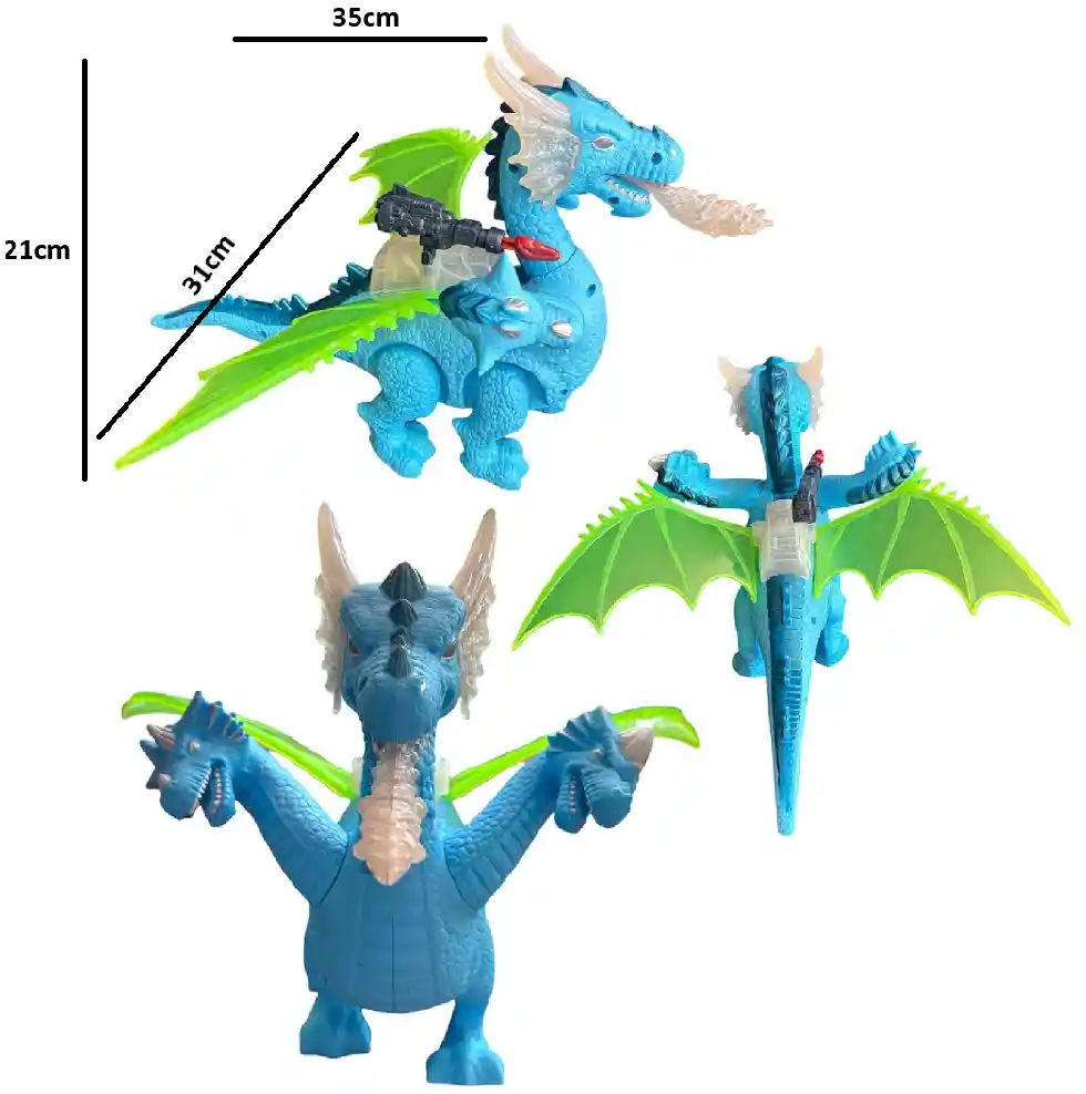DINOSAURIO DE TRES CABEZAS CON ALAS, EMITE LUZ Y SONIDO, CAMINA Y LANZA MISIL MANUALMENTE, FUNCIONA CON TRES BATERIAS DOBLE A NO INCLUIDAS. Las puede agregar a su orden. Medidas aproximadas: 31 cm de ancho, 35cm de largo y 22cm de alto.