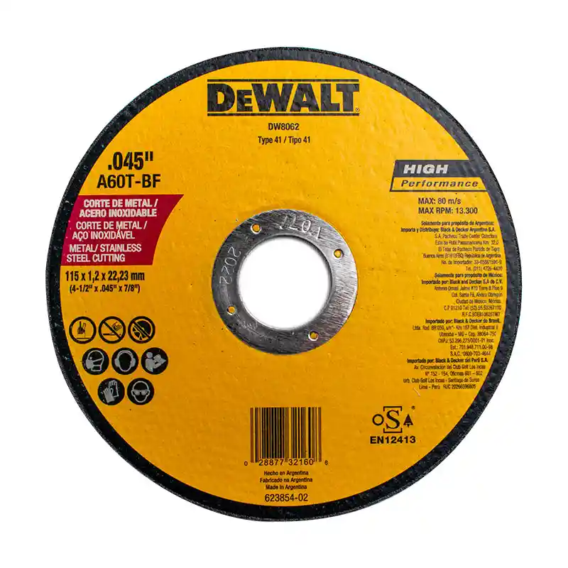 Diseñados para un corte rápido y una vida útil prolongada, los discos de corte de metal DEWALT Tipo 1 HP cuentan con un diseño de disco delgado para cortes rápidos y sin rebabas y una mezcla de materiales patentada para prolongar la vida útil del disco. El grano de óxido de aluminio ofrece una acción de corte agresiva. las láminas de fibra de vidrio ofrecen durabilidad y seguridad.