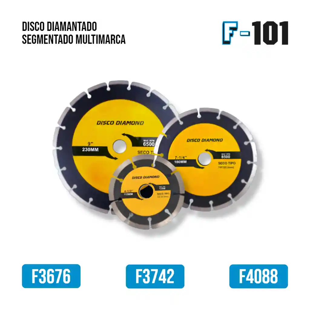 Disco con la banda diamantada segmentada (separada por espacios) para cortar materiales como ladrillo, piedra, granito, etc. Ofrecen la máxima velocidad de corte. Por otra parte, el acabado es más burdo.