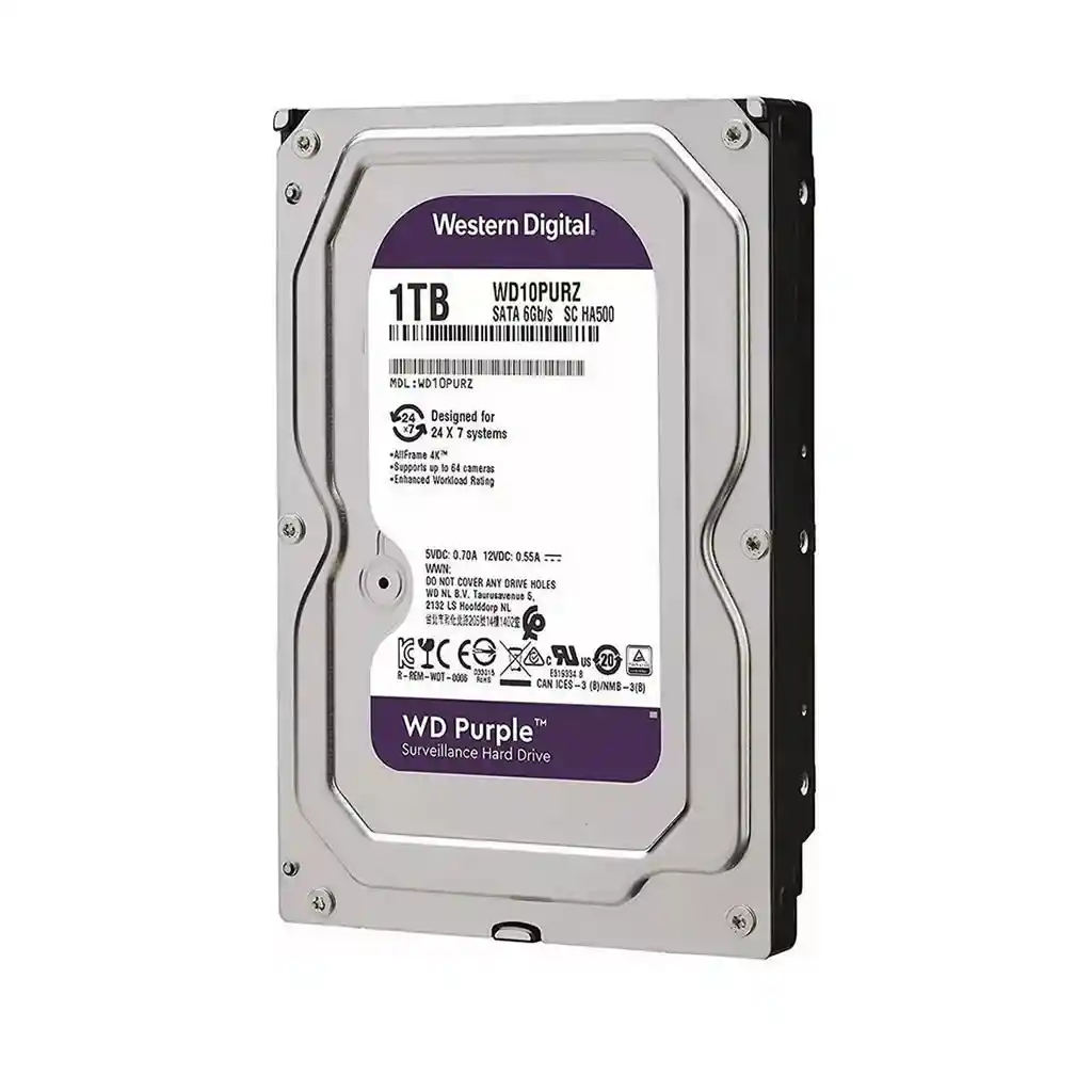 HD Western Digital WD Purple Surveillance 2 TB 256 MB WD23PURZ SATA : diseñado para sistemas de seguridad de alta definición con un funcionamiento ininterrumpido. Con soporte para hasta 64 cámaras, las unidades WD Purple están optimizadas para sistemas de vigilancia. Diseñadas para soportar el análisis de aprendizaje profundo en NVR compatibles con inteligencia artificial, presentan una mayor carga de trabajo nominal. - Las unidades WD Purple se han diseñado específicamente para las exigencias extremas de los sistemas de vigilancia ininterrumpida de alta temperatura. - La unidad WD Purple está diseñada para sistemas de seguridad DVR y NVR, y es compatible con muchos de los principales fabricantes de sistemas de vigilancia y seguridad. - Marca: Western Digital - Modelo: WD23PURZ - Capacidad: 2 TB - Interfaz: SATA - Formato: 3.5 pulgadas - Tecnología de grabación: RMC - Velocidad: 5400 RPM - Velocidad de transferencia de la interfaz: 6 Gb/s 180 MB/s - Compatibilidad: hasta 64 cámaras por unidad para sistemas de vigilancia y seguridad con más de ocho compartimentos. - Certificaciones: BSMI, ICES-003/NMB-003, CE, FCC, KC, Maghreb, RCM, UKCA, VCCI, CB-Scheme, TUV, UL . Dimensiones (largo x ancho x alto): 5,79 x 4 pulgadas x 1,03 pulgadas.