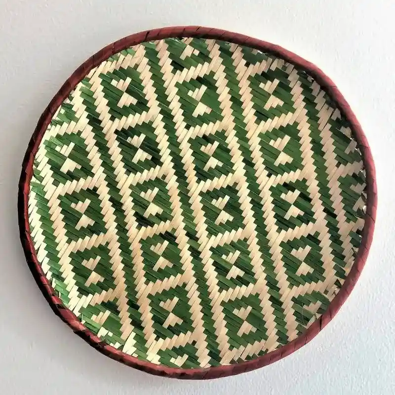 Un disco lleno de textura y color para colgar o decorar la mesa. Medidas: Diámetro 25 cms / Material: Paja Tetera / Región: Cauca / Técnica: Cestería / Etnia: Eperara