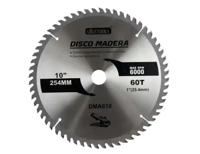 Referencia: DMD724 Tamaño: 10" (254mm) Modelo: Disco Corte Madera 60 Dientes de Carburo Velocidad Máxima: 6000 RPM Apto para Cortes de Madera Longitudinales y Transversales..