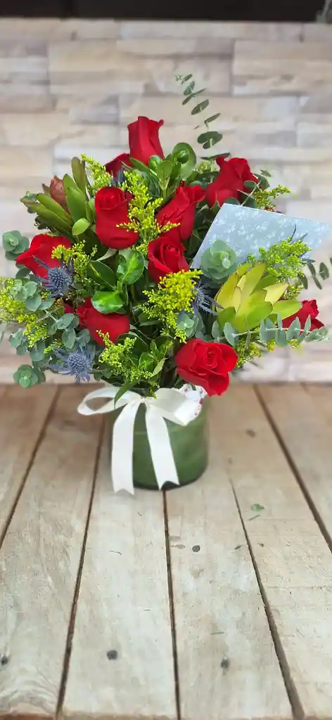 Diseño floral en base de vidrio elaborado con 24 rosas, lirios o proteas, solidago y eucalipto baby