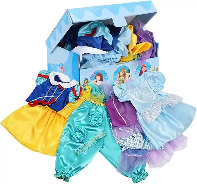 ♛ Traje de baño para niñas para disfraz de Halloween, fiesta de Navidad o disfraz diario a juego. Los disfraces se pueden llevar en cualquier momento de los años. Recomendado para la mayoría de 3 a 6 años ♛ 5 disfraces de princesa diferentes para mezclar y combinar (viene en un bonito organizador de cartón reutilizable). Incluye vestido de princesa amarillo, 2 vestidos de princesa azules, vestido de disfraz de jazmín, vestido de princesa de sirena. 5 camisetas separadas, 3 faldas y un pantalón con cintura elástica, 2 diademas ♛ Todos los vestidos de princesa están hechos de poliéster de primera calidad con costuras suaves para un ajuste cómodo. Todos los vestidos de disfraz caben en un bonito baúl para colección y almacenamiento. Gran opción de regalo para tu pequeña princesa ♛ Adorable vestido de princesa con cierre de velcro en la parte posterior que es fácil de poner y quitar. Color brillante y diseño único. Suficientes vestidos de disfraz para tu princesa y sus amigos juegan disfraces de princesa simultáneamente ♛ Cada niña siempre sueña como princesa. Consigue a tu niña un traje de baño de princesa VGOFUN y haz que se sienta como una verdadera princesa. Nota: los zapatos de vestir y los accesorios de joyería no están incluidos