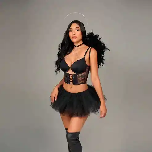El ángel más lindo del inframundo a llegado a nuestra tierra para deleitar con su encanto. *Usa el bralett de tu disfraz como prenda exterior. Podrás verte hermosa en halloween y casual es resto del año. Especificaciones Género FEMENINO Composición 93% POLIESTER - 7% ELASTANE No. de Piezas 5 Incluye TIARA, GARGANTILLA, BRALETT, TUTU Y ALAS Cuidado y limpieza Lavar a mano con agua fría y un detergente suave. Evita el uso de blanqueadores, el secado en máquina y el retorcido, ya que pueden dañar las fibras delicadas. Sécala al aire libre, preferiblemente a la sombra, y guárdala en un lugar limpio y seco para conservar su forma y suavidad.
