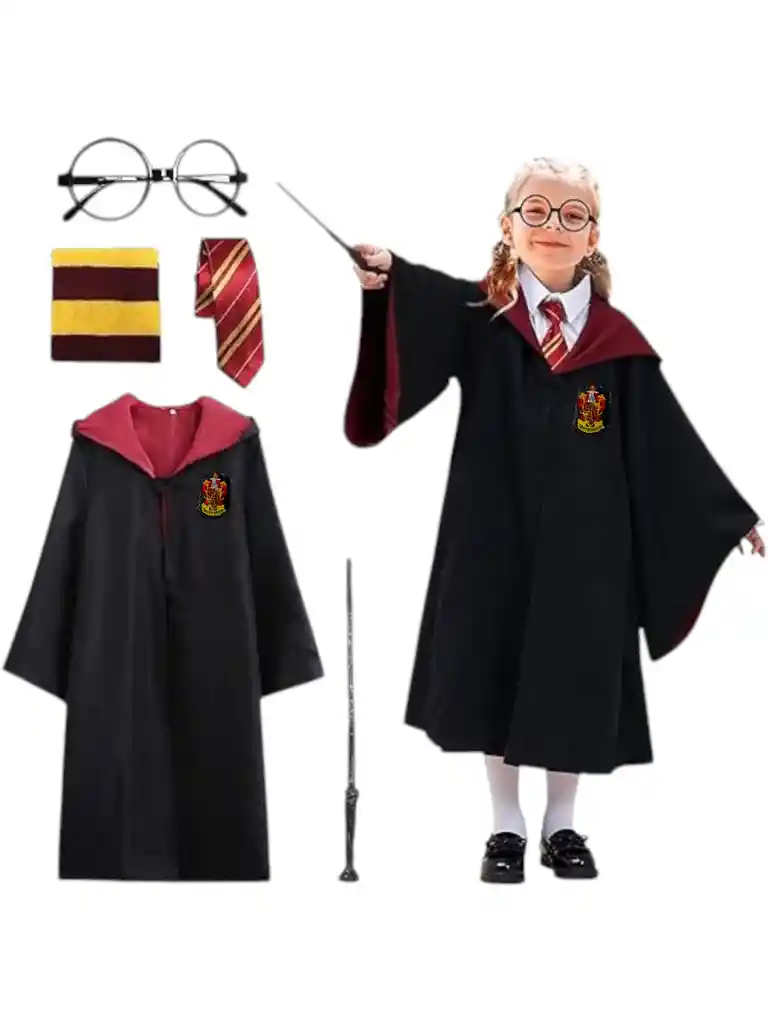 DISFRAZ DE HARRY POTTER NIÑO Descripción: Material: Poliéster Contenido: Capa, Bufanda, Corbata, Gafas, Varita de Mago MEDIDAS Y TALLAS Tallas Disponibles: S largo desde el hombro 87 cm largo total con capota 120 cm ancho del pecho 42 cm largo de la manga 55 cm ancho de la manga 28 cm Si deseas adicionar otros Articulos a tu compra puedes escribirnos, para poder ayudarte.