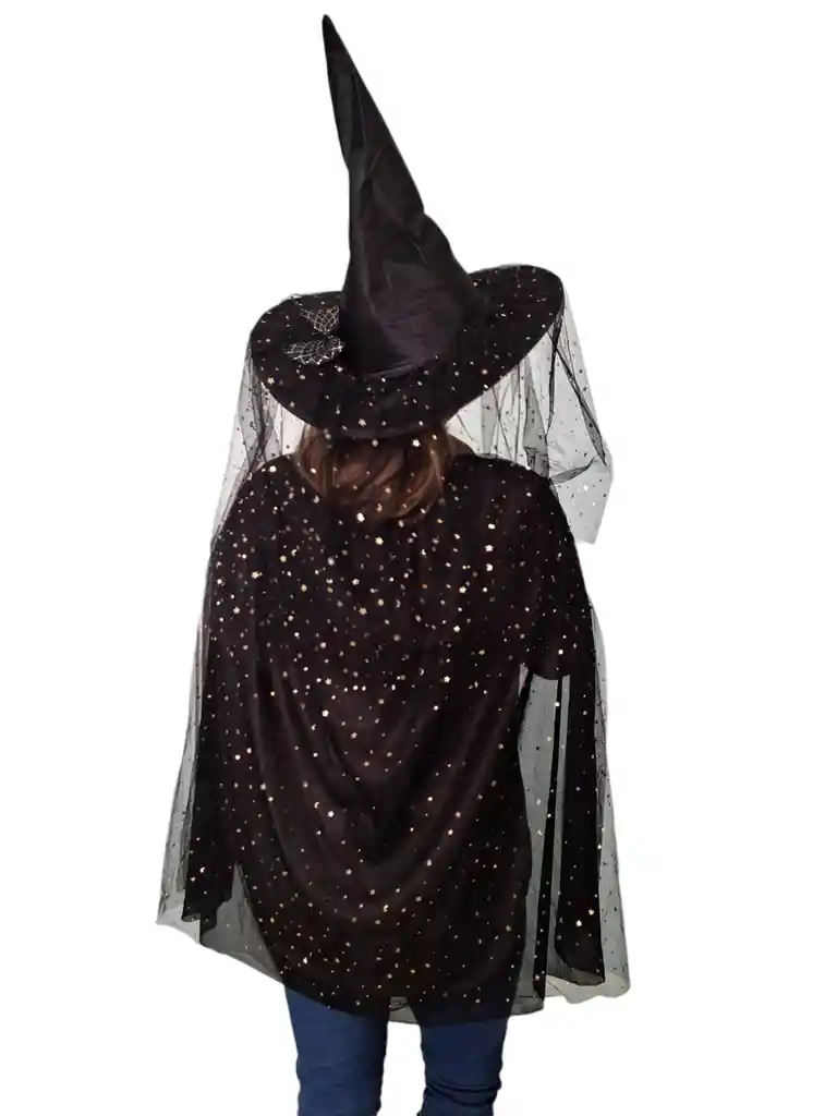 Disfraz para Halloween de bruja capa+ sombrero capa larga de tela con estampado dorado de estrellas y lunas sombrero de malla con estampado dorado tematica de halloween con velo de estrellas largo de la capa de 70x120 cm ideal para tu disfraz de halloween con bonitos acabados indicanos si deseas algo adicional para tu disfraz
