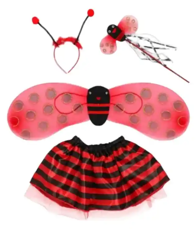 Tu compra incluye: 1 alas: 30X23 CM 1 tutú :28 Cm de alto 1 diadema: 23 de alto 1 varita : 34 de alto Transforma a tu pequeña en una encantadora abeja o una alegre mariquita con este completo disfraz, ideal para Halloween o cualquier ocasión de cosplay. Diseñado específicamente para niñas, este disfraz brinda una experiencia mágica al momento de disfrutar la diversión de los disfraces. Incluye todos los accesorios necesarios para completar el look: unas brillantes alas, una divertida diadema, un tutú esponjoso que añade volumen y una varita para ese toque extra de encanto. La marca Halloween ha creado este disfraz pensando en la comodidad y el estilo, utilizando materiales de alta calidad que garantizan durabilidad y bienestar durante el uso. Con un diseño atractivo y colorido, tu niña destacará en cualquier evento, ya sea una fiesta de Halloween, un desfile escolar o una celebración temática. Fomenta su creatividad y anima a que exprese su personalidad a través de este disfraz que promete horas de diversión. El disfraz no solo es perfecto para atraer todas las miradas, sino que también es ideal para jugar e imaginar aventuras como una dulce abeja polinizadora o una alegre mariquita. Completa su atuendo con un poco de maquillaje facial y dejarás que brille con su propia luz. Permite que tu hija viva la experiencia de ser el centro de atención en cada evento, creando recuerdos inolvidables en cada disfraz.