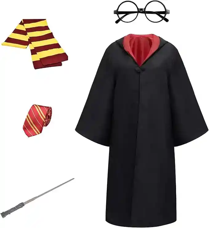 Este disfraz de Harry Potter está inspirado en el icónico uniforme del joven mago de la saga de J.K. Rowling. Incluye una túnica negra larga con capucha, adornada con el escudo de la casa Gryffindor en el pecho. La túnica se abre por delante y suele llevarse sobre una camisa blanca y una corbata a rayas rojas y doradas, representando los colores de su casa. El conjunto puede completarse con gafas redondas, una varita mágica (similar a la que Harry utiliza en las películas), y una cicatriz en forma de rayo pintada en la frente. Algunos disfraces también incluyen un suéter gris con bordes dorados y rojos, y pantalones oscuros. Ideal para fiestas de disfraces, Halloween o eventos temáticos, este atuendo convierte a cualquier fan en un auténtico estudiante de Hogwarts.