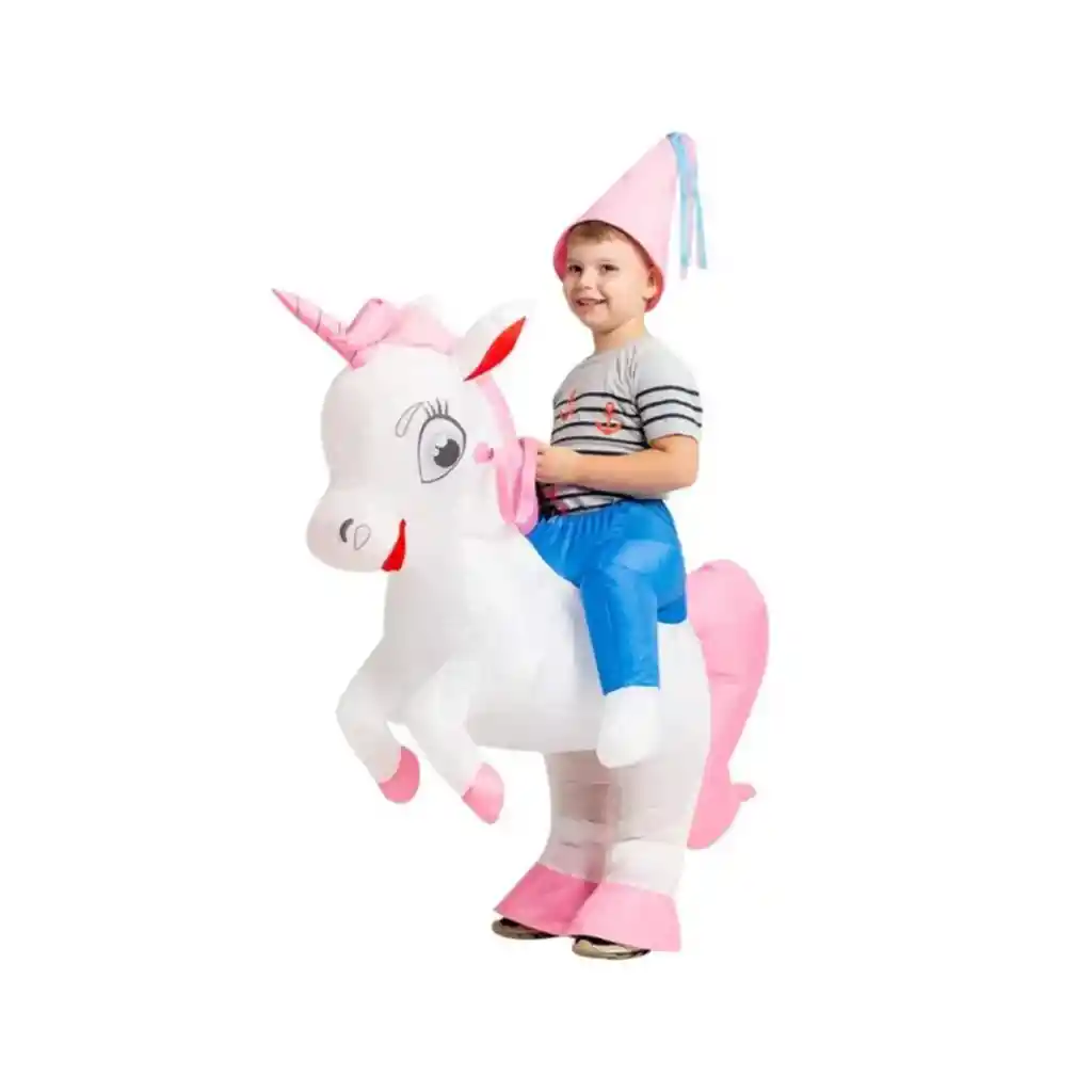Disfraz Inflable De Unicornio Goosh Para Niños Disfraz de unicornio inflable de lujo. Fabricado con 100% poliéster. El paquete incluye hoja de instrucciones, bomba de aire y un gorro bonito. La bomba de aire requiere un banco de energía portátil o 4 pilas AA. Pilas NO incluidas. Haz que el disfraz de tu hijo sea unico