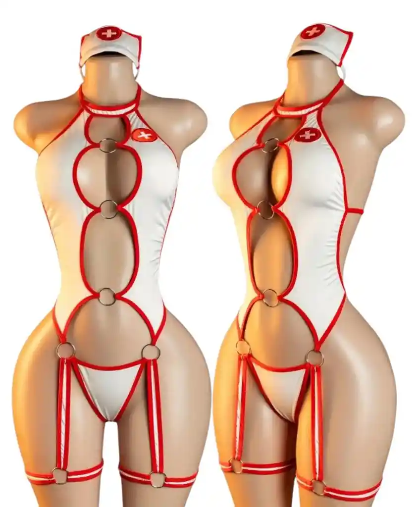 Disfraz de enfermera sexy con espalda descubierta, tirantes halter, bodysuit tipo tanga y gorro de enfermera