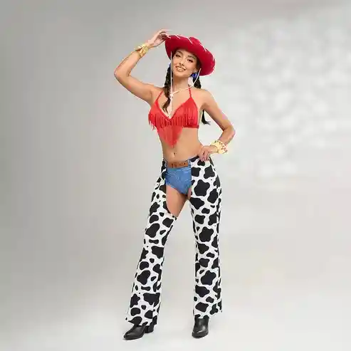 Súbete a la fantasía del salvaje oeste con nuestro Disfraz Miss Rodeo, diseñado para encender la noche con un estilo salvaje y sensual. Incluye un top rojo de escote pronunciado, un short estilo denim y unas chaparreras estampadas en print de vaca, que resaltan las curvas con un toque provocador. El sombrero vaquero rojo le da el detalle final para convertirte en la protagonista más sexy del rodeo. Características: Material: Polyester 93% Elastane 7% Talla: Única Color: Rojo y negro Incluye: Sombrero, Top, Puños, Short, Cinturón y Chaparreras de Tela.