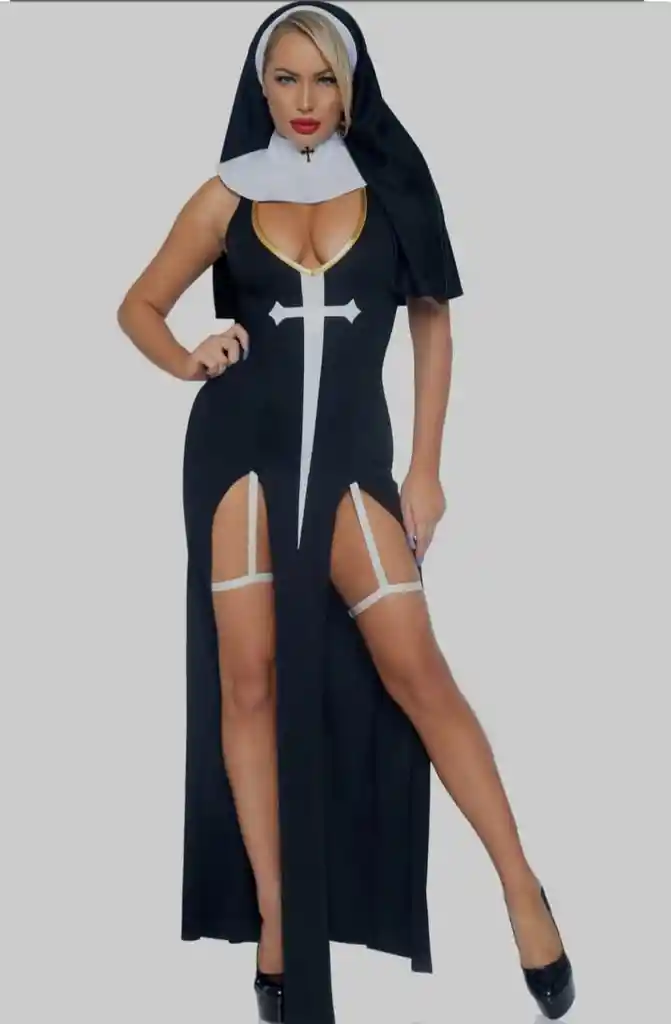 Disfraz monja largo. Vestido en talla única. Incluye vestido, cofia, cuello, tanga y liguero.