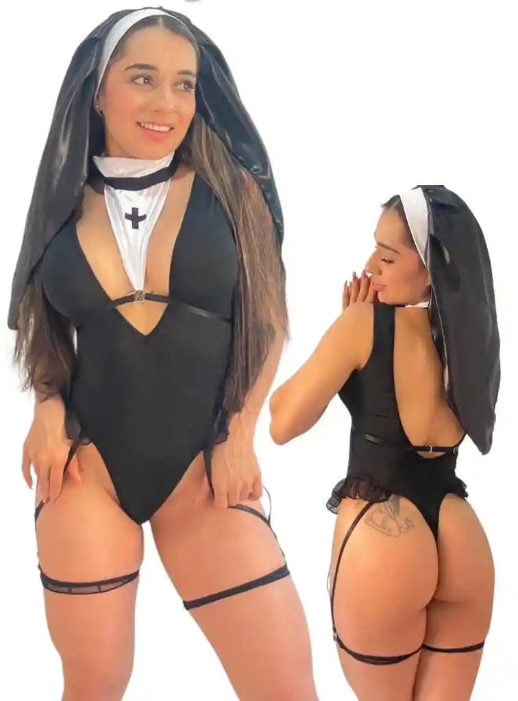 Libera tu lado más atrevido y pecaminoso con nuestro audaz disfraz de monja malvada! Este conjunto, que combina la solemnidad del hábito con un toque provocador, es la elección perfecta para quienes buscan un look que desafíe todas las reglas. Características: Body seductor: El body de una pieza, con su profundo escote en V, está diseñado para realzar tu figura. Los detalles de tiras y ligas ajustables le dan un aire de misterio y audacia. Detalles provocadores: El cuello de solapa blanco, con una cruz negra, y el velo de monja le dan al disfraz un toque de fantasía, mientras que los volantes de tul en la parte inferior añaden un detalle coqueto. Accesorios que Enamoran: El disfraz se completa con las ligas ajustables que se adhieren a los muslos, haciendo del conjunto una pieza inolvidable. Materiales de calidad: Confeccionado con telas suaves y cómodas que se ajustan perfectamente a tu figura, garantizando una experiencia agradable y sexy.