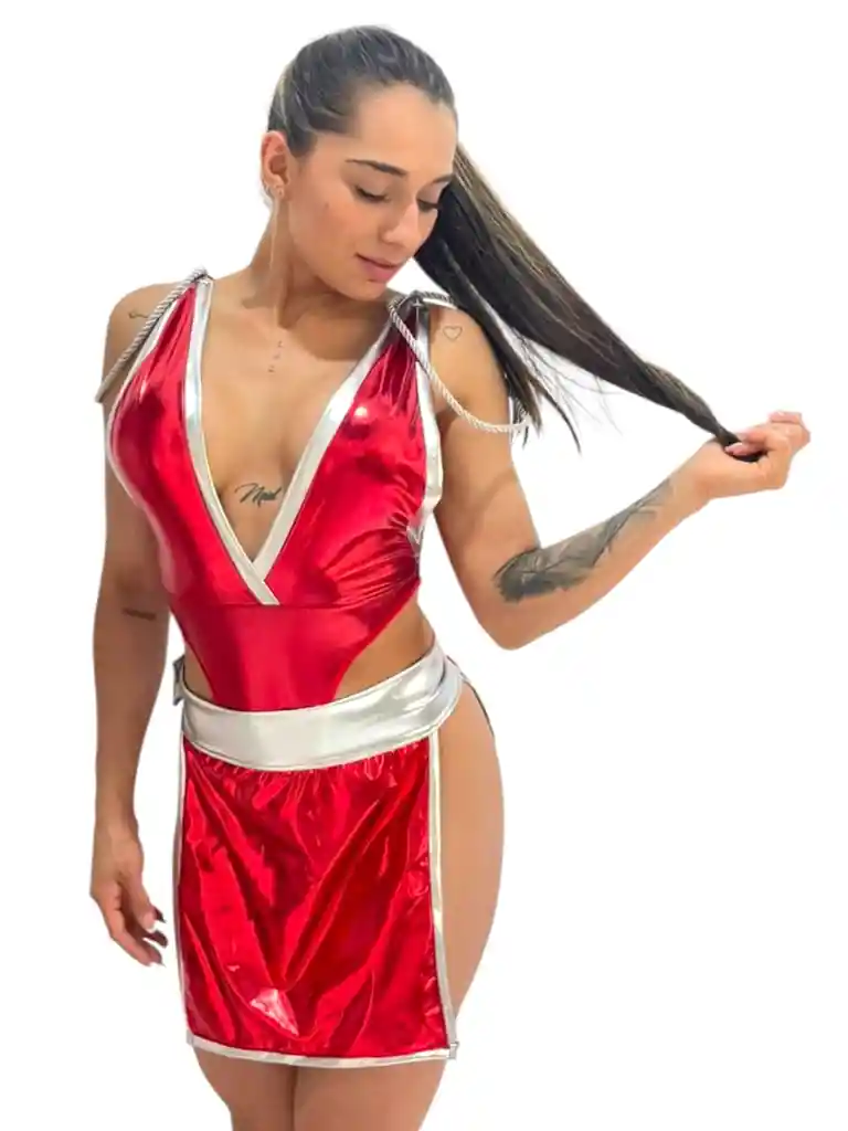 Prepárate para la misión más sexy con este atrevido disfraz de ninja! Este atuendo de guerrera moderna y audaz es perfecto para destacar en fiestas de disfraces, eventos de cosplay, o cualquier ocasión en la que quieras combinar un aura de peligro con un estilo deslumbrante. Body Seductor: Un body ajustado en un llamativo color rojo metálico brillante, con un profundo escote en V que realza la figura. Los ribetes en plateado a lo largo del cuello, hombros y cintura le dan un aspecto de armadura moderna y estilizada. El corte en la cintura añade un toque extra de sensualidad. Minifalda con Paneles: Una minifalda corta en el mismo material rojo brillante, diseñada con paneles asimétricos que se abren en los lados, mostrando las piernas de forma elegante y audaz. Los ribetes plateados en los bordes complementan el diseño del body. Detalles de Hombros: El disfraz cuenta con tiras en los hombros con un diseño de armadura plateada, que simulan las hombreras de un guerrero, dándole un toque de autenticidad y fuerza. Material y Confección: Fabricado con tela elástica y brillante de alta calidad, este disfraz es cómodo de llevar y se adapta perfectamente a las curvas del cuerpo. La combinación de rojo metálico y plateado crea un contraste visual impactante que te hará el centro de todas las miradas. Ideal para: Halloween, fiestas temáticas de héroes o fantasía, cosplay y sesiones de fotos.