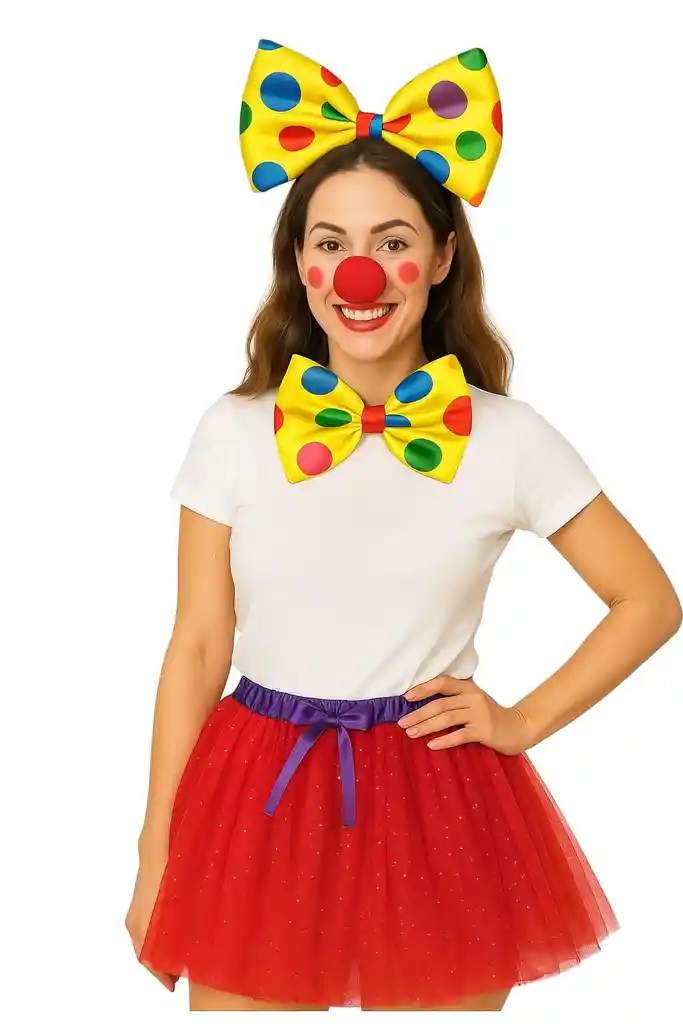 DISFRAZ DE PAYASITA ADULTO Descripción: 1 nariz bolita 1 diadema 1 corbatín 1 tutu multicolor 38 CM Si deseas adicionar otros Articulos a tu compra puedes escribirnos, para poder ayudarte.