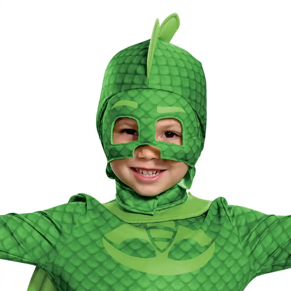 Disfraz Pj Masks Gekko Con Capa Disfraz de Halloween Gekko de PJ Masks niño con capa desmontable Tallas Disponibles: Para niños pequeños 2T, 3T y 4T Incluye: mono con capa desmontable, cola desmontable y tocado