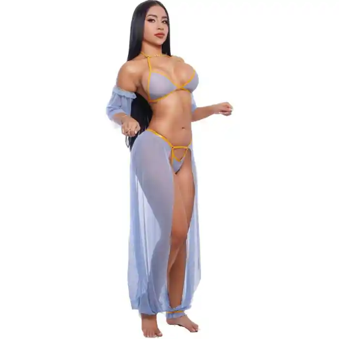 Disfraz Jazmin Aladdin El Disfraz Jazmin Aladdin te hará sentir digna del Olimpo. Siéntete sexy y hermosa con este Disfraz La transparencia y el diseño del pantalón harán único este disfraz erótico, las mangas elevan el traje y complementan el diseño para que sea de ensueño.