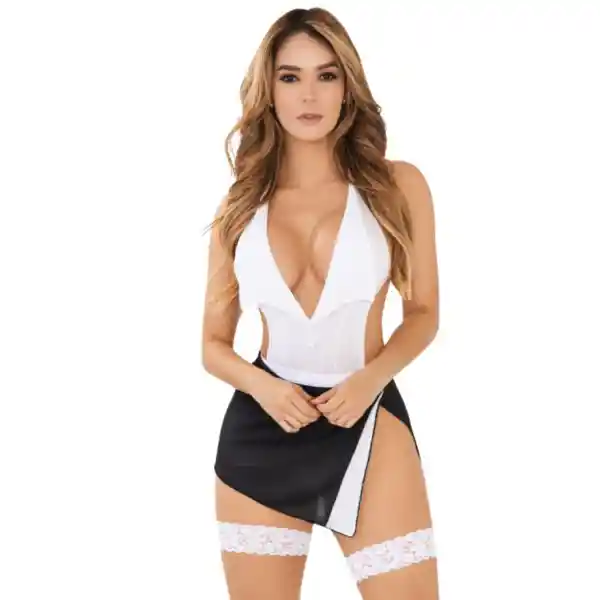 Nada más sensual que este disfraz para cumplir órdenes y atender de la mejor manera a quien lo solicite. CARACTERÍSTICAS: Material: Nylon 75%, Elastane 25% Color: Blanco y azul Incluye: Body, Falda, Ligas CUIDADOS: por su material requiere que sea lavado a mano usando agua fría y secado a la sombra, tenga en cuenta que al ser una prenda delicada no se recomienda el uso de desinfectantes o planchas.