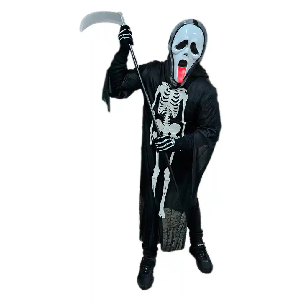 Ser el Grim Reaper no es fácil especialmente en la noche de Halloween. Este disfraz junto a los accesorios son perfectos solo para los suficientemente atrevidos a asumir ese papel la noche de Halloween. viene con su bata negra, al igual que la muerte se representa en varias reproducciones populares de él. El material ligero hace que sea fácil llevar tu propia ropa debajo Junto a una hoz que es segura de usar, perfecta para complementar el disfraz de Halloween. 98 cm de largo Hecho de plástico Guantes calaveras el accesorio perfectos para complementar el disfraz. Material: hechos de lana. Por último, el disfraz viene con una máscara moldeada que hace que tu transformación sea completa. Todo se combina para un estilo aterrador que realmente brilla durante la temporada de Halloween. Terror tradicional.