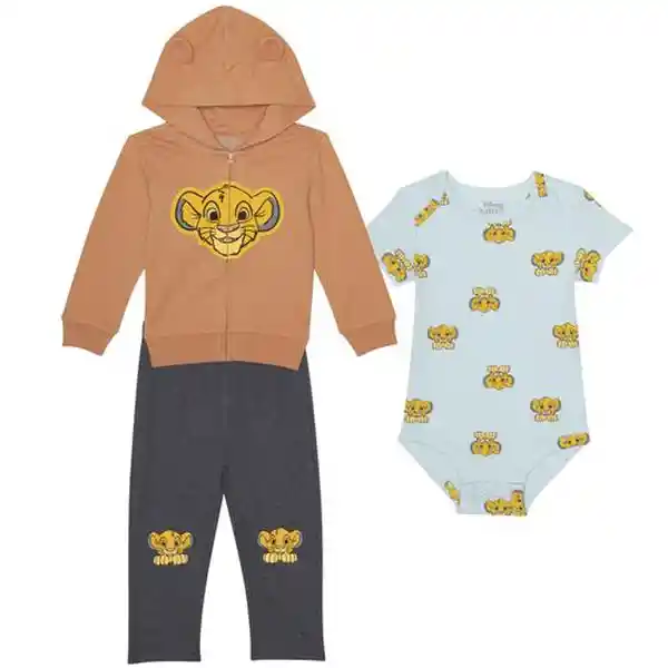 Haz Que tu Bebé Luzca Adorable Con su Personaje Favorito de Disney Junto al Conjunto de 3 Piezas: Body Leggings y Sudadera Con Capucha. Elige Entre Mickey Mouse Pluto o Simba de el Rey León. Fabricado Con Materiales de Alta Calidad Para la Comodidad de tu Pequeño.