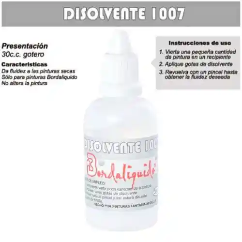 medio para aclarar el color de las pinturas a la vez puede recuperarlas si se estaban secando y han perdido su consistencia líquida, dándole de nuevo fluidez. Viene en una presentación de 30cc con boquilla de gotero, para fácil dosificación. ¿Como se utiliza el disolvente bordaliquido? Se utiliza juntando con pinturas bordaliquido, para darle fluidez sin alterar la pintura. Recupera pintura secas para darle de nuevo la fluidez, y volver a las perfectas condiciones que busca para sus manualidades o cuadros. Precauciones: Solo utilizar para pinturas bordaliquido. Aplique con cuidado revolviendo hasta que obtenga el resultado que desea, para no aclarar demasiado. Instrucciones de uso: 1. Vierta una pequeña cantidad de pintura en un recipiente 2. Aplique gotas de disolvente 3.Revuelva con un pincel hasta obtener la fluidez deseada