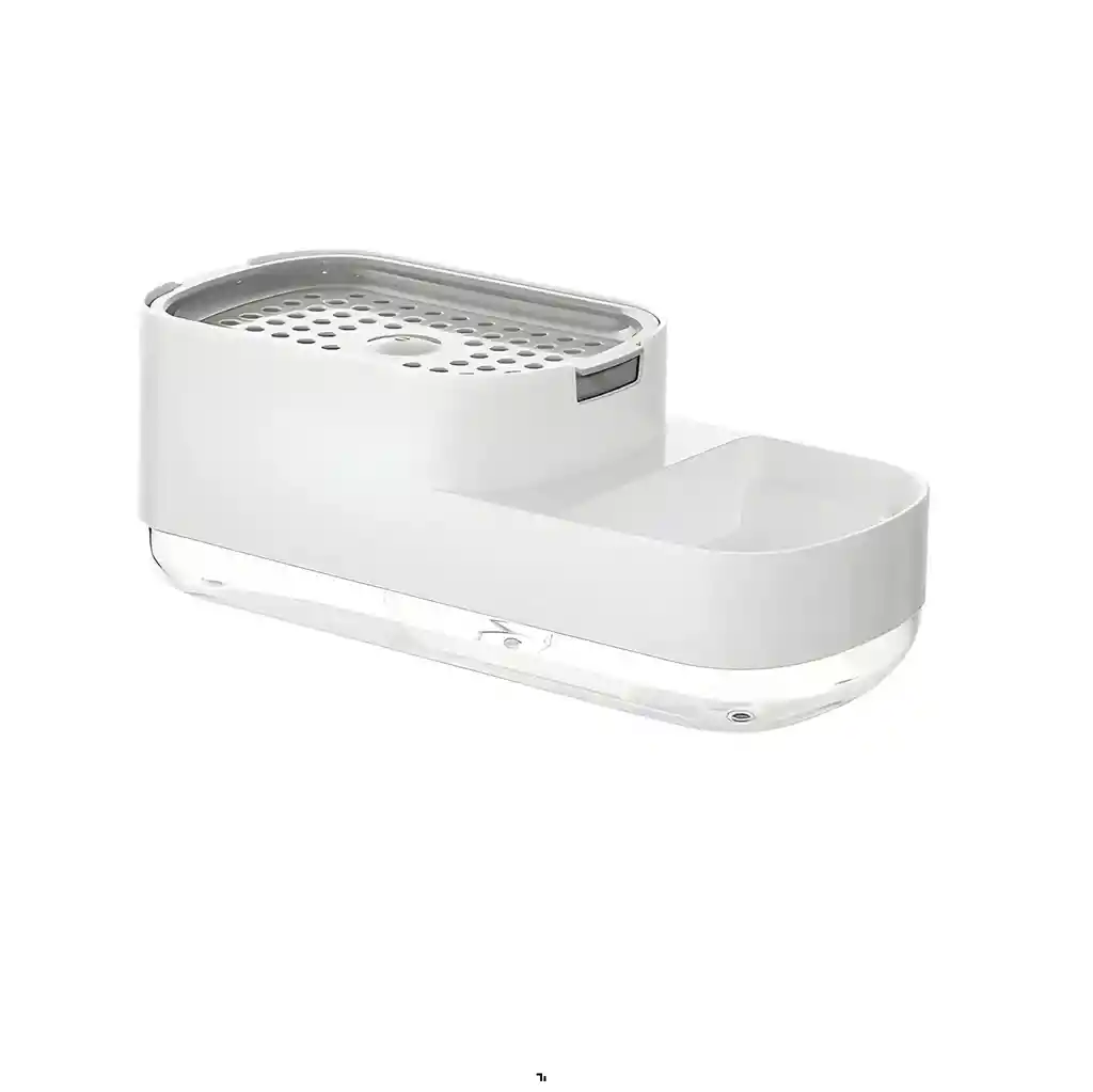 Dispensador de jabón para loza incluye una esponja. Mantén tu fregadero ordenado y funcional con este dispensador de jabón con soporte para esponja, un práctico accesorio diseñado para optimizar el espacio y facilitar las tareas de limpieza en la cocina. Este organizador integra un dispensador de jabón líquido y un compartimento para esponja, permitiendo tener ambos elementos en un solo lugar para mayor comodidad. Su sistema de dosificación permite aplicar la cantidad adecuada de jabón directamente sobre la esponja, haciendo el lavado de platos más rápido y eficiente. Su diseño compacto y moderno en color blanco se adapta fácilmente a cualquier estilo de cocina, aportando una apariencia limpia y organizada al área del fregadero. Además, está fabricado con materiales resistentes y duraderos, ideales para el uso diario. Es una solución práctica para quienes buscan mantener la cocina más organizada, ahorrar espacio y mejorar la eficiencia al momento de lavar utensilios. Características principales Dispensador de jabón líquido con soporte para esponja Diseño multifuncional que optimiza el espacio del fregadero Permite aplicar jabón directamente sobre la esponja Diseño moderno y compacto en color blanco Material resistente y fácil de limpiar Ideal para cocinas, lavaderos o áreas de limpieza Cuidados del producto Limpiar regularmente con agua tibia y jabón suave para evitar acumulación de residuos. Evitar el uso de productos abrasivos que puedan dañar la superficie. Vaciar y enjuagar el dispensador periódicamente para mantenerlo en buen estado. Forma de uso Abrir el compartimento del dispensador. Llenar con jabón líquido para lavar platos. Colocar la esponja en el soporte designado. Presionar la esponja sobre el dispensador para liberar la cantidad de jabón necesaria. Utilizar la esponja para limpiar utensilios o superficies. Recomendaciones de uso Utilizar con jabón líquido para cocina. No sobrellenar el depósito para evitar derrames. Mantener el área del fregadero seca para prolongar la vida útil del producto.