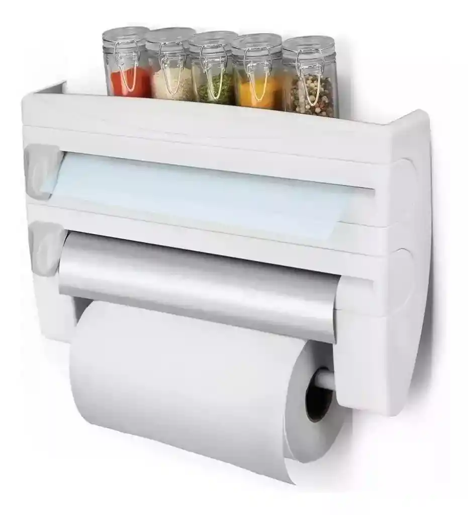 Optimiza tu cocina con el dispensador porta rollos cortador 4 en 1, un accesorio versátil y práctico que permite organizar y manejar fácilmente papel de aluminio, papel film y papel de cocina. Fabricado en plástico ABS resistente, este dispensador es duradero, seguro y ecológico, además de contar con un diseño moderno y funcional. Su sistema de corte bidireccional con cuchilla oculta garantiza cortes precisos sin esfuerzo ni riesgo, evitando bordes desiguales o desperdicio de material. Incorpora una repisa superior para almacenamiento adicional y se puede fijar fácilmente en la pared o debajo de un gabinete con los accesorios incluidos, ahorrando espacio y manteniendo el área de trabajo ordenada. Gracias a sus ventosas en la base, se adhiere firmemente a superficies lisas para un uso estable y cómodo. Ideal para cualquier cocina, este dispensador facilita la preparación y limpieza de forma rápida y eficiente. ¡Haz que tu cocina sea más organizada y funcional con este imprescindible accesorio! Ficha Técnica: Tamaño: 38 x 18 x 7 cm. Capacidad: Soporta rollos de hasta 4.5 cm de diámetro en los dos compartimentos superiores. Admite rollos de hasta 12.5 cm de diámetro en el compartimento inferior externo. Uso: Ideal para la cocina, facilita el acceso y corte de papel aluminio, film plástico y toallas de papel. Calidad: Producto nuevo, de alta gama y durabilidad. Atención al cliente: Consulte antes de ofertar y con gusto le atenderemos. Material: Plastico ABS ** _Para defectos de fábrica o retractos: \**_Por favor revise el producto apenas lo reciba y antes de usarlo. No aplican ley de retracto o defectos de fábrica luego de usar el producto. Se manejan máximo 5 días para reportar defectos de fábrica (por ejemplo, producto funciona mal, piezas faltantes, rotas, etc). Para hacer efectiva la devolución el producto debe devolverse con el empaque original, el cual debe estar en buen estado, incluir todos los documentos y las partes completas y sin daños.