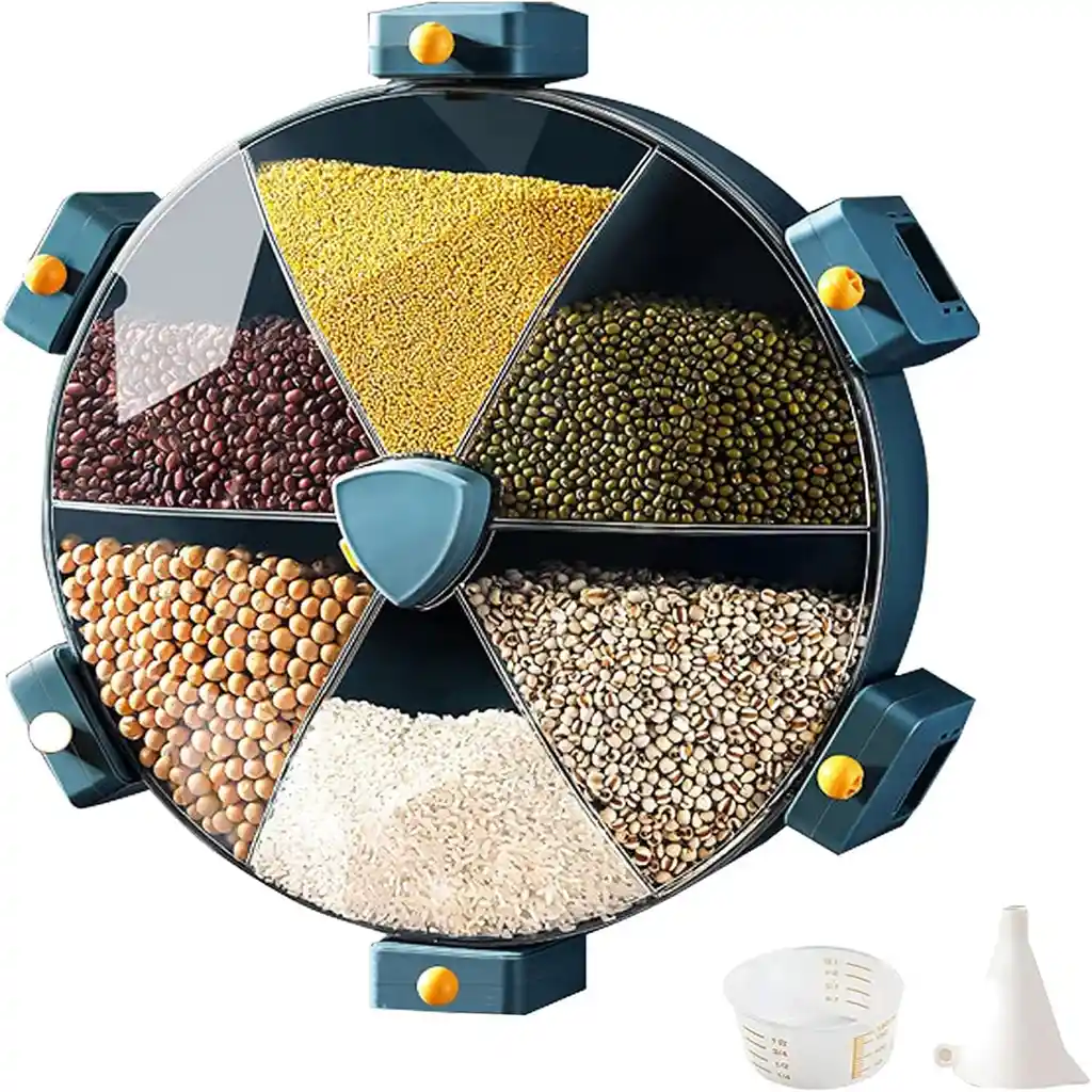 Organizador giratorio con múltiples compartimientos para arroz, granos y cereales. Dosificación fácil con botón, diseño compacto y práctico para mantener tu cocina ordenada.