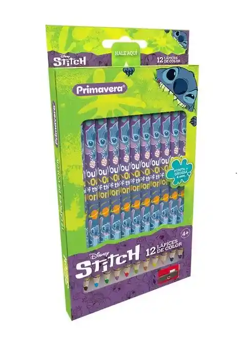 Colores Estampados Motivo Stitch Punta Gruesa 4mm, Trazo Suave, Incluye sacapunta Caja x12 colores Marca Primavera