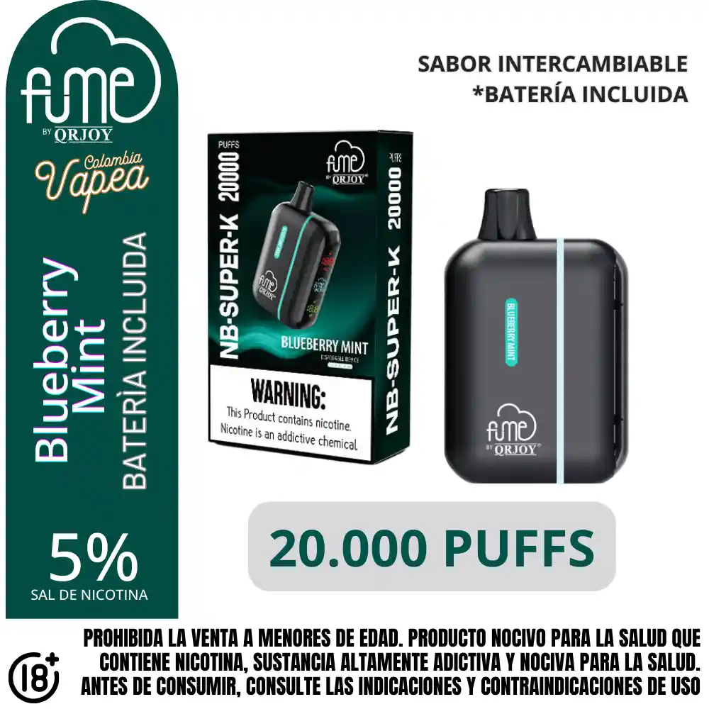 Dispositivo Recargable incluye Pod Desechable marca Fume sabor a Blueberry Mint. Fuerza de nicotina: 5%. Sal de nicotina equivalente a aproximadamente 1 paquete de cigarrillos. Capacidad de la batería: 1040 mAh. Número de bocanadas: hasta 20.000 Puffs o caladas. Prohibida la venta a menores de edad. Producto nocivo para la salud que contiene nicotina, sustancia altamente adictiva. Antes de consumir consulte las indicaciones y contraindicaciones de uso.