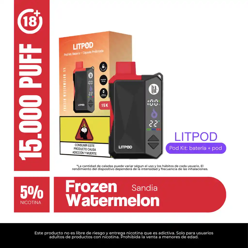 Dispositivo Recargable incluye Pod Desechable marca Lit sabor a Frozen Watermelon. Fuerza de nicotina: 5%. Sal de nicotina equivalente a aproximadamente 1 paquete de cigarrillos. Capacidad de la batería: 1300 mAh. Número de bocanadas: hasta 15.000 Puffs o caladas. Prohibida la venta a menores de edad. Producto nocivo para la salud que contiene nicotina, sustancia altamente adictiva. Antes de consumir consulte las indicaciones y contraindicaciones de uso.
