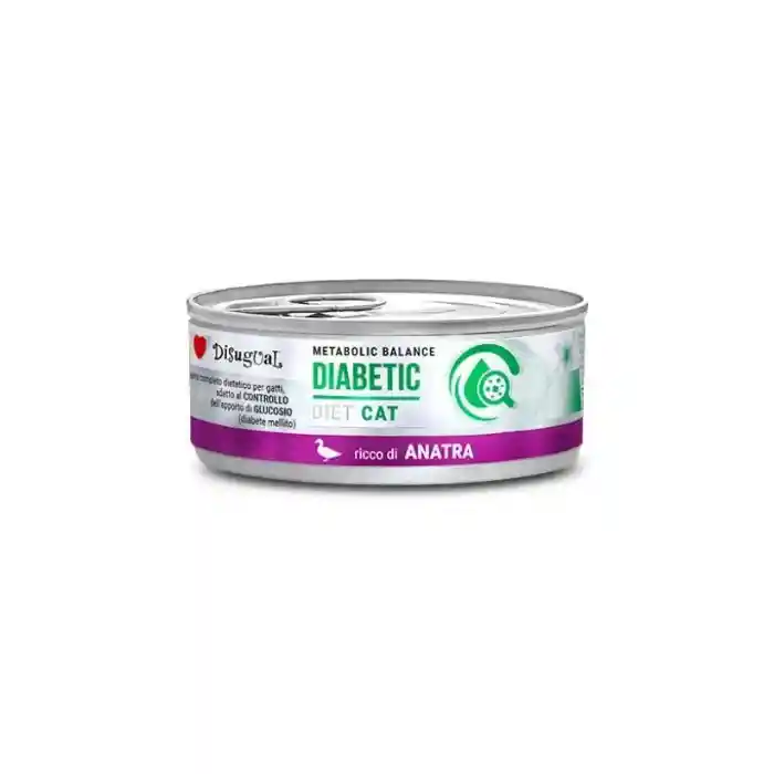 Disugual Equilibrio metabólico Gato Diabético Pato 85 Gr Alimento dietético completo para gatos, indicado para el CONTROL de la ingesta de GLUCOSA (diabetes mellitus). Características nutricionales esenciales: – Formulado con ingredientes altamente digeribles – Sin cereales añadidos – Contiene aceite de coco Presentación: 85 gr