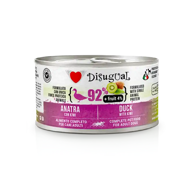 Disugual Dog Fruit Pato y Kiwi es una deliciosa comida húmeda en lata para perros, hecha con una combinación única de pato y kiwi. Esta receta ofrece una fuente de proteínas de alta calidad junto con la frescura y los beneficios del kiwi, proporcionando una alimentación equilibrada y saludable para tu mascota. Características: Ingredientes naturales: Elaborado con pato fresco y kiwi, sin conservantes ni colorantes artificiales. Formato práctico: Lata de 150 gramos, ideal como porción diaria o complemento alimenticio. Apto para todas las razas: Adecuado para perros de todas las edades y tamaños. Beneficios: Proteínas de alta calidad: El pato es una excelente fuente de proteínas que favorece la salud muscular. Rico en antioxidantes: El kiwi aporta vitaminas y antioxidantes que refuerzan el sistema inmunológico. Fácil digestión: Ingredientes naturales que favorecen una digestión suave y saludable. Receta equilibrada: Perfecta para mantener a tu perro lleno de energía y vitalidad. Disugual Dog Fruit Pato y Kiwi es una excelente elección para quienes buscan una alimentación natural, nutritiva y sabrosa para sus perros, combinando lo mejor de la carne de pato y el kiwi para promover su bienestar integral.