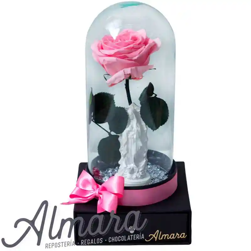 Caja de Lujo joyero decoración con diamantes imitación Virgen 13 cm Tableta 15*7cm elaborada en chocolate blanco con colorantes alimenticios Ocho ferreros Domo de vidrio 27cm por 12.5cm de diámetro Rosa Preservada Color rosado Almara Anchetas chocolates caja rellenos,desayunos, perdón, sorpresas