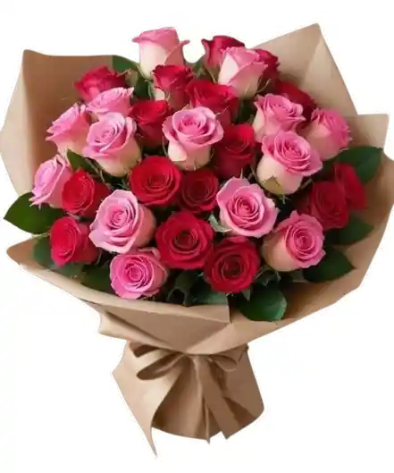 Un bouquet imponente de rosas rojas y rosadas que combina intensidad y ternura en un solo detalle inolvidable. Flores frescas de calidad premium, seleccionadas y armadas profesionalmente para un acabado elegante y abundante. Algunas flores pueden variar según la disponibilidad de temporada, manteniendo siempre la estética y el valor del arreglo. Incluye tarjeta personalizada sin costo adicional.