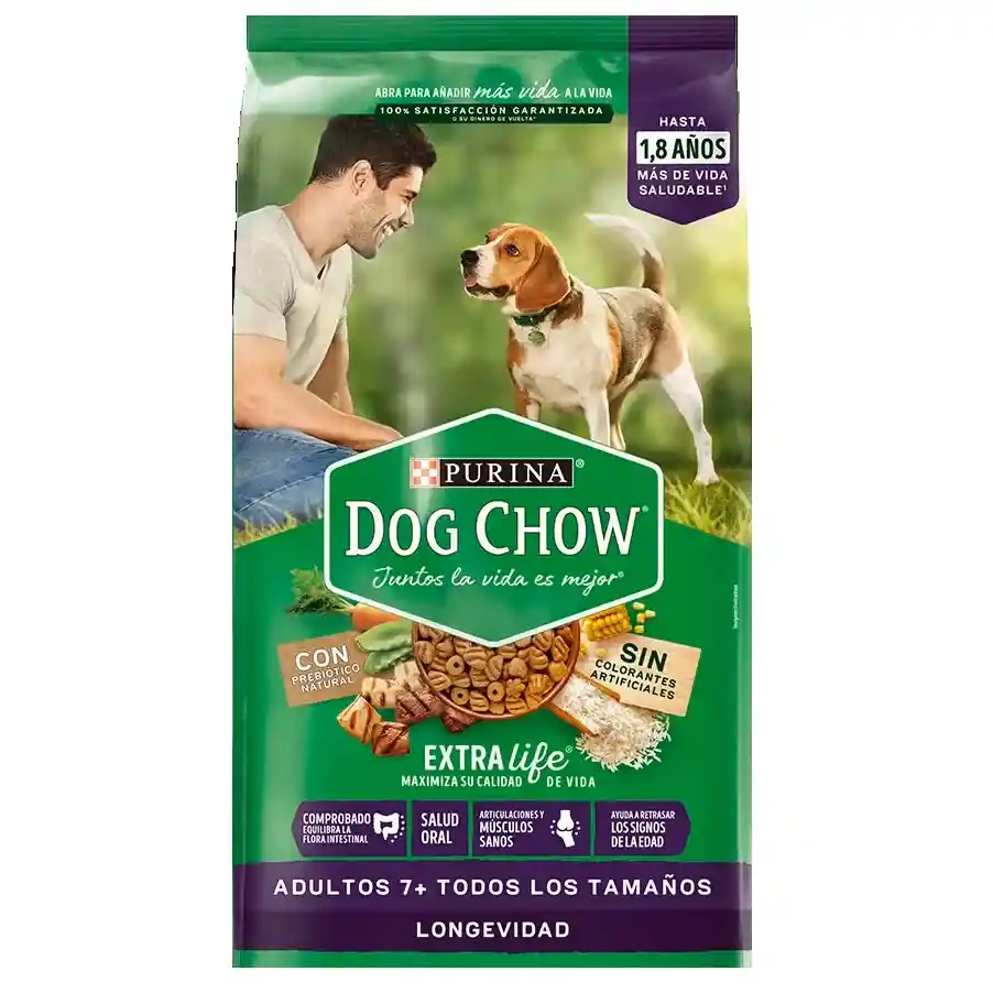 ¡Más Años, Más Vida! Tu mejor amigo ha estado a tu lado en cada aventura, y ahora es momento de devolverle todo ese amor. Con Dog Chow® Longevidad, no solo lo alimentas; le regalas calidad de vida para que siga disfrutando cada momento junto a ti. Diseñado para todos los tamaños, este alimento ayuda a tu perro a alcanzar hasta 1.8 años más de vida saludable. Porque sabemos que "juntos la vida es mejor", haz que su etapa dorada sea la más vibrante.