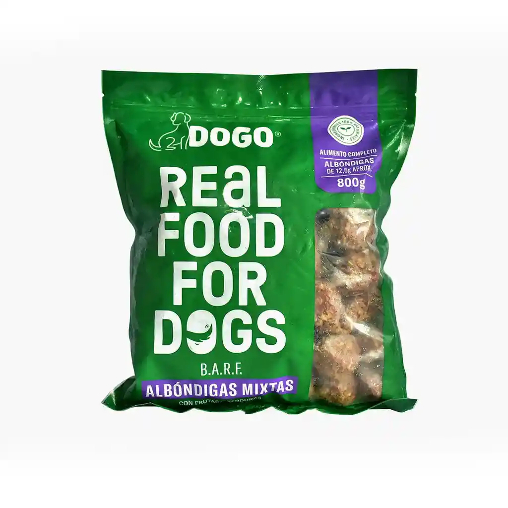 Menú BARF congelado, con proteína de cerdo, res y pollo de gran valor nutricional. 100% natural y balanceado. En presentación de 800 g (aproximadamente 64 bolas tipo albóndiga de aproximadamente 12,5 g c/u) que hace más fácil su manejo. Producto hecho con materia prima premium y altos estándares de calidad.