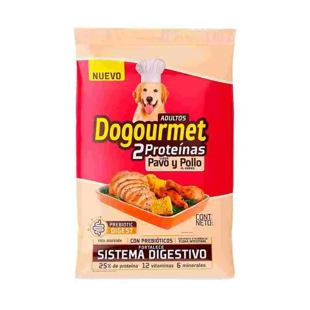 Dogourmet Adulto Pavo y Pollo es un alimento seco, completo y balanceado diseñado para perros adultos de todas las razas, enfocado en brindar nutrición esencial con un sabor apetecible. Su fórmula con doble proteína (pavo y pollo) ayuda a mantener músculos fuertes, ofrece alta palatabilidad, fortalece el sistema inmunológico con vitaminas A y E, y mejora la digestión.Beneficios Principales: Mantenimiento Muscular: Las proteínas de origen animal (pavo y pollo) contribuyen a mantener músculos fuertes y sanos. Sistema Digestivo Saludable: Incluye ingredientes de fácil digestión y, en algunas presentaciones, la tecnología Prebiotic Digest (probióticos) para fortalecer la salud intestinal. Salud Inmunológica y Visual: Enriquecido con vitaminas A y E, las cuales ayudan a fortalecer el sistema de defensa y a mejorar la visión. Energía y Vitalidad: Contiene vitaminas del complejo B que proporcionan energía para la actividad diaria del perro adulto. Huesos y Dientes Fuertes: Fórmula balanceada con calcio y fósforo, crucial para la salud ósea y dental. Alto Sabor: Diseñado con un sabor atractivo a pavo y pollo al horno, ideal para perros exigentes.
