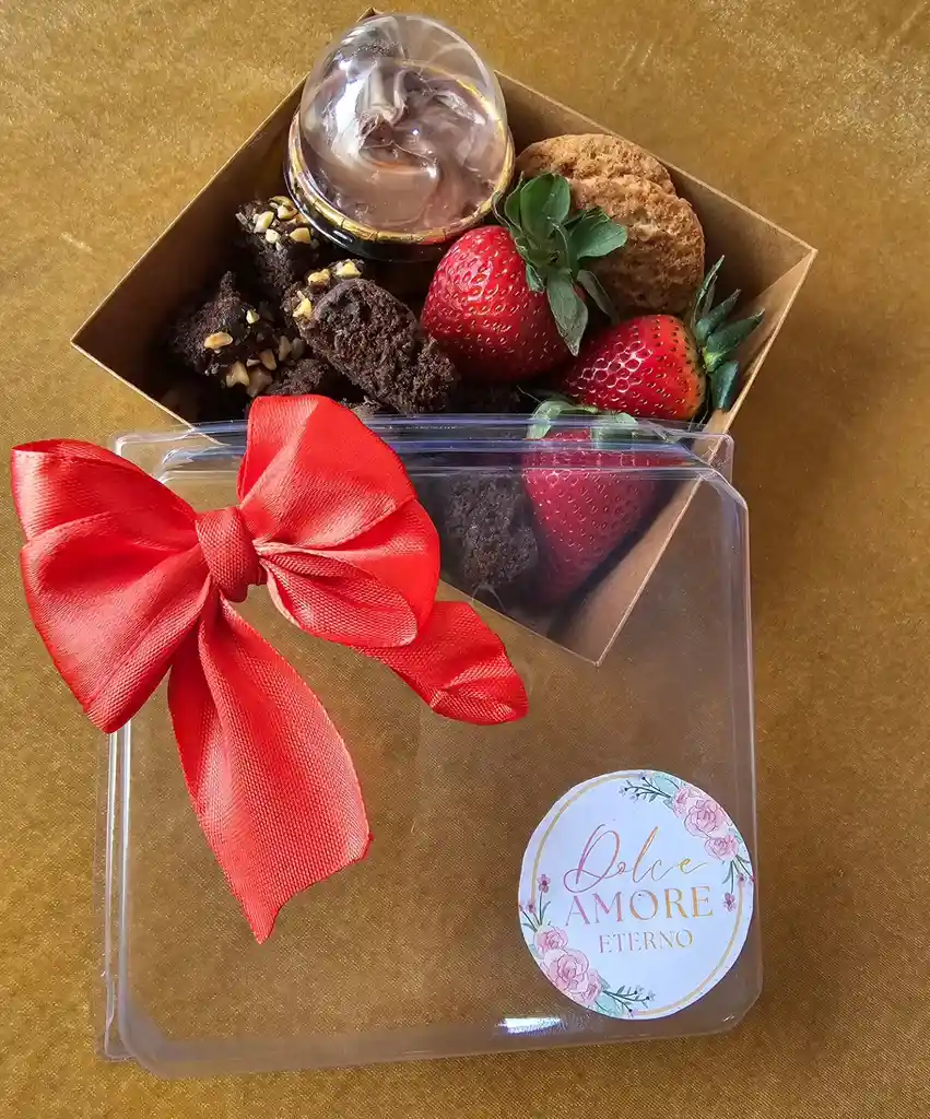 caja con brownies , galletas , fresas y nutella
