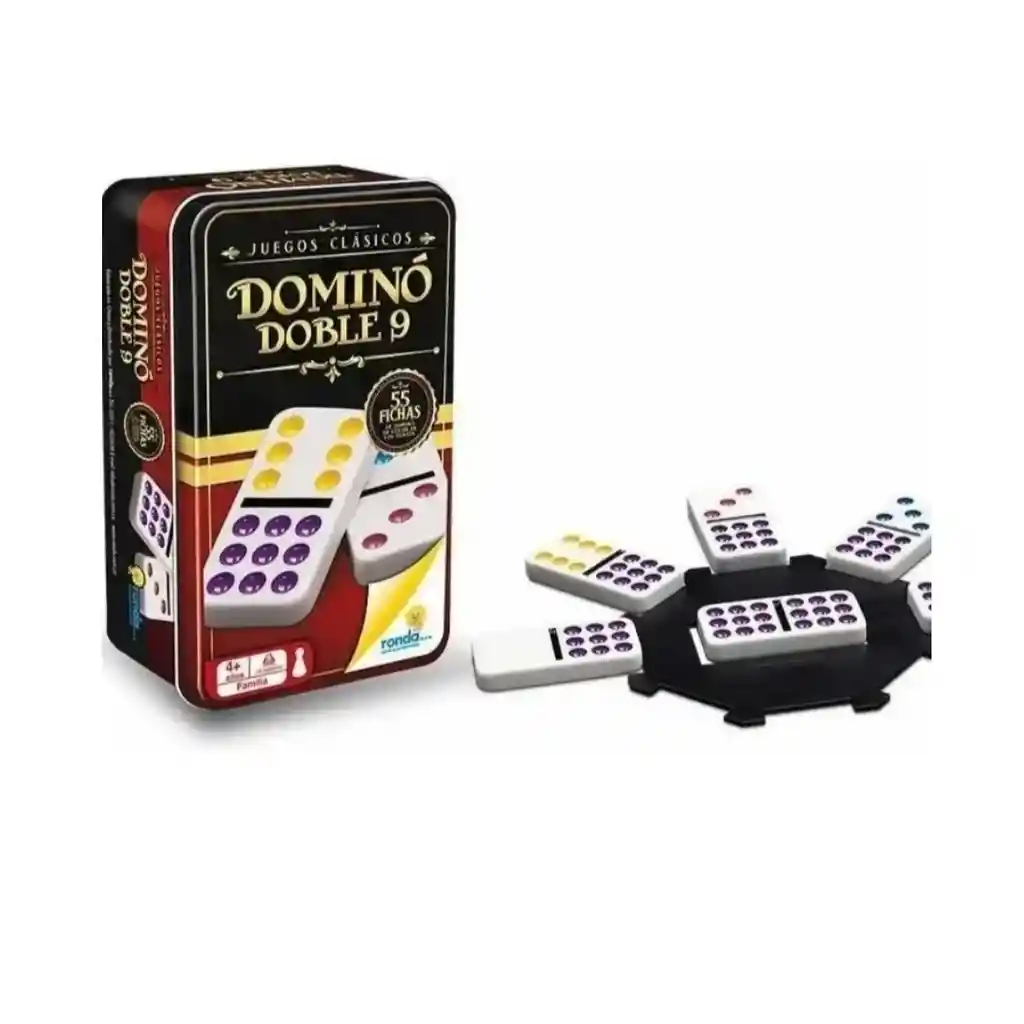 El Dominó es un juego de mesa en el que se emplean unas fichas rectangulares, generalmente blancas por la cara y negras por el envés, divididas en dos cuadrados, cada uno de los cuales lleva marcados de uno a seis puntos, o no lleva ninguno.El juego completo de fichas de dominó consta de 28 piezas, en cada una de las cuales se representa un par de valores posibles.Excelente Juego para toda tu familia y amigos para llenar los momentos de diversión.Caja metálica para su transporte.Fichas con puntos de colores, con un fino acabado.Domino DOBLE 9 es de 55 fichas grandes.