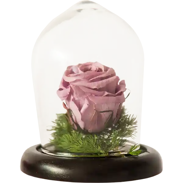 Arreglo floral con Urna de vidrio y base en madera color wengue, en su interior una cabeza de rosa estándar natural preservada, que perdura intacta por meses, sobre una base de follaje preservado. Viene en Bolsa de lujo e Incluye tarjeta.